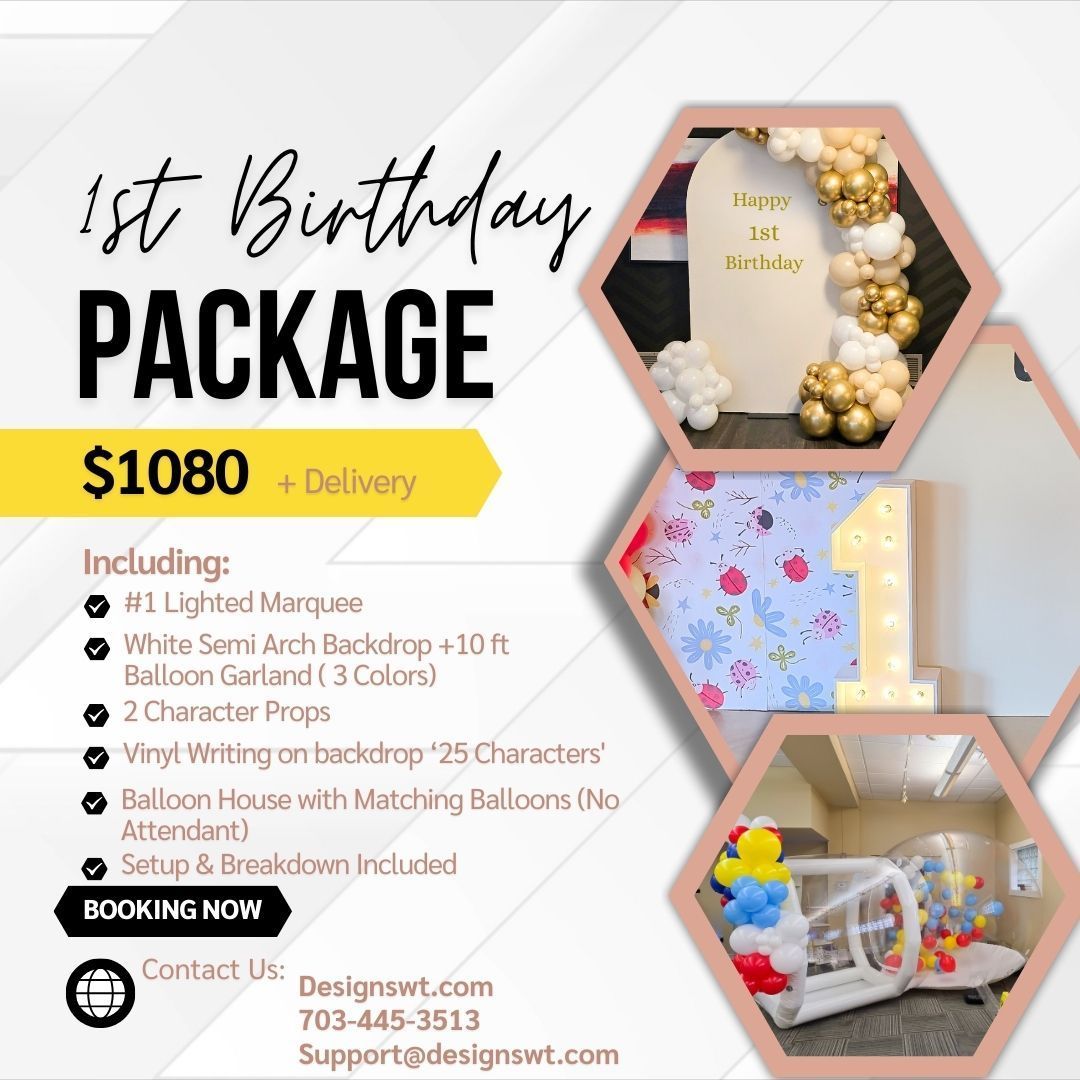 Make your child’s first birthday unforgettable with a complete décor package designed to wow. From the #1 marquee and custom backdrop to the balloon garland, props, and balloon house—we take care of everything. Setup and breakdown are included, giving you a stress-free celebration.