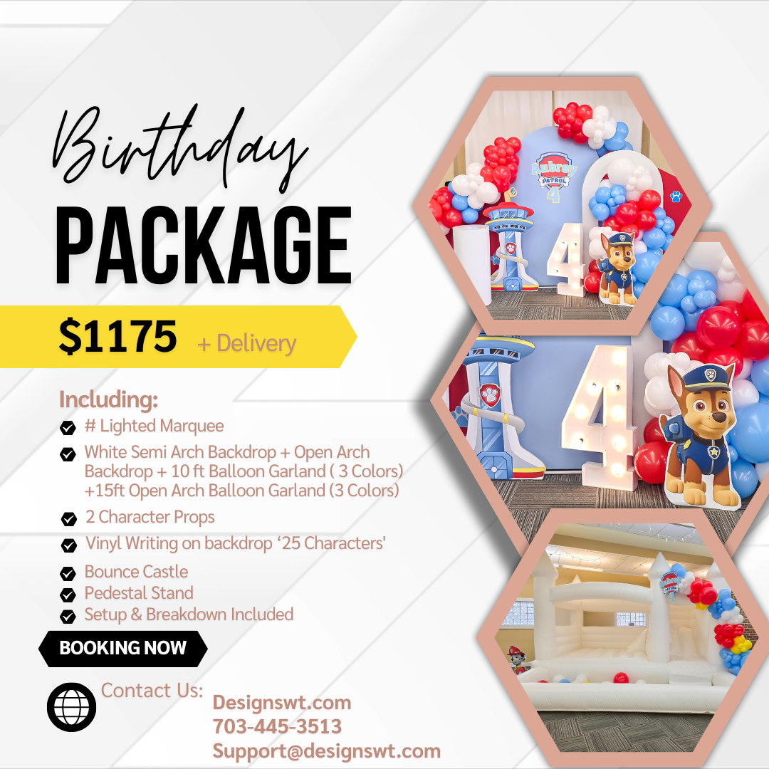 Make your child’s birthday unforgettable with a complete décor package designed to wow. From the #1 marquee and custom backdrop to the balloon garland, props, and balloon house—we take care of everything. Setup and breakdown are included, giving you a stress-free celebration.