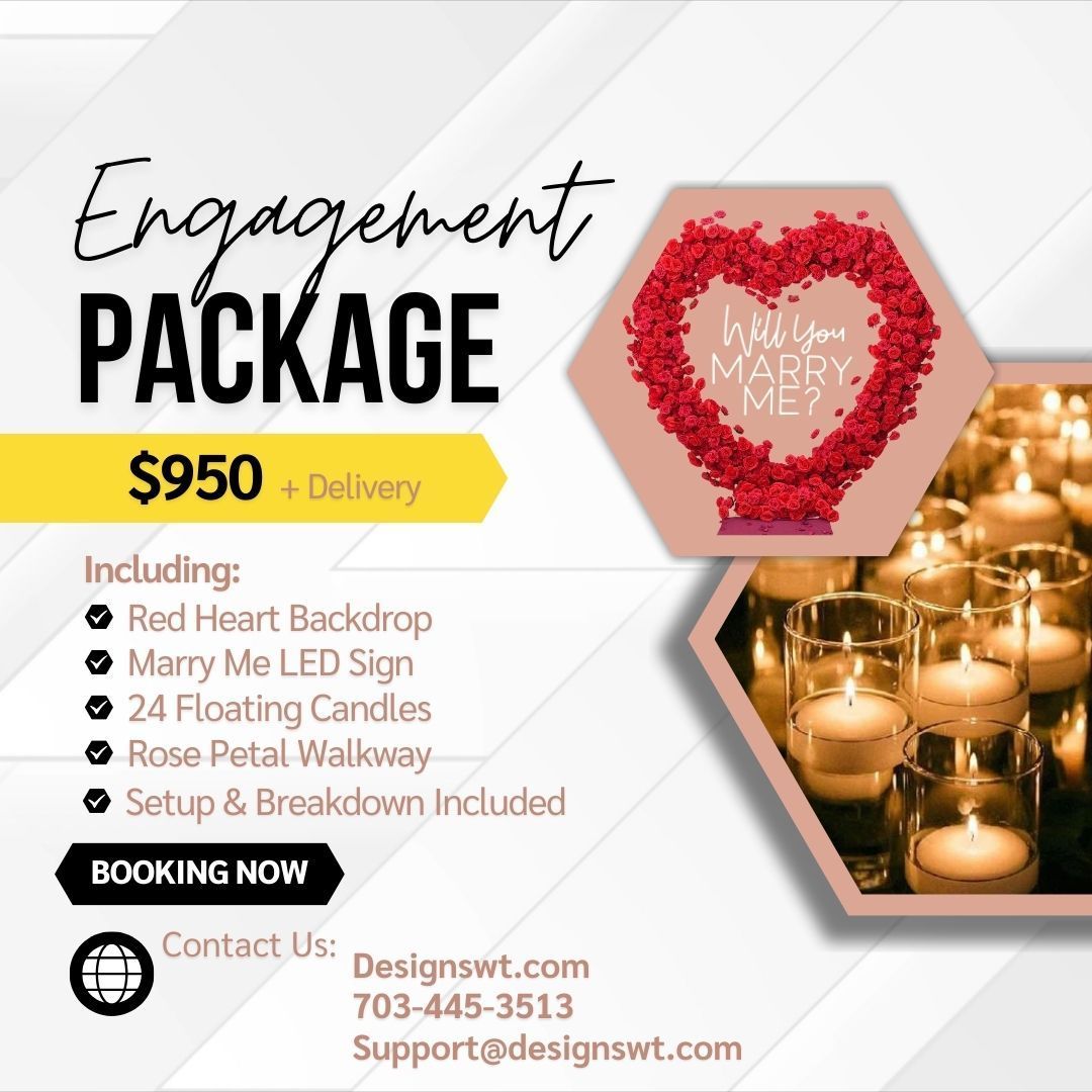 Create a breathtaking moment they’ll never forget. Our Engagement Package includes a luxury heart backdrop, candlelit ambiance, and romantic rose petals; all fully designed, set up, and broken down by our team. You simply show up, celebrate your “YES,” and let us handle the rest.